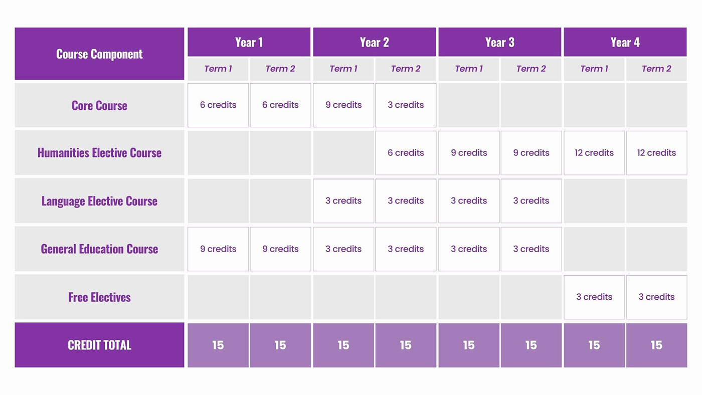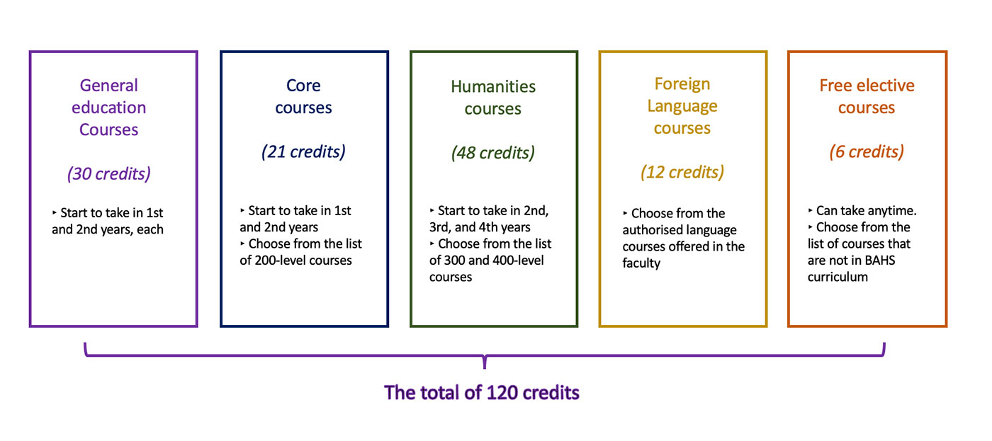 To complete BAHS program, students have to complete the minimum requirements of credit points in the following 5 catagories: